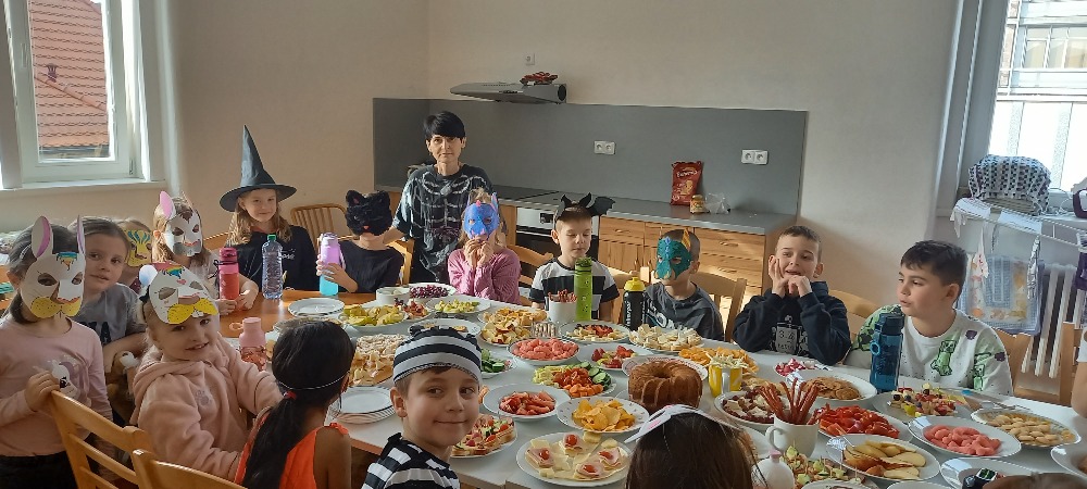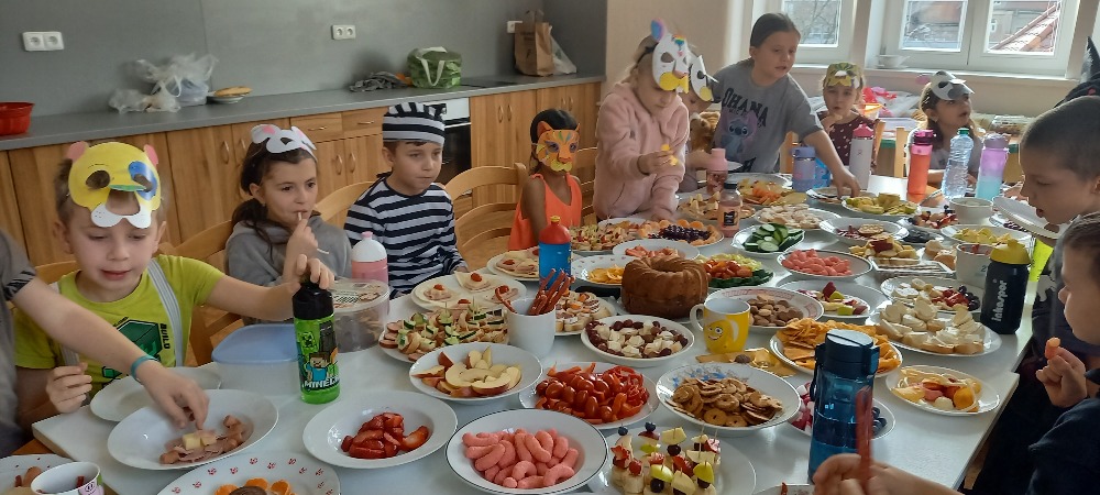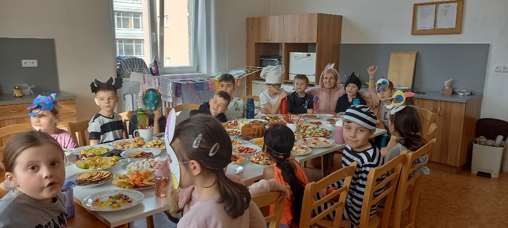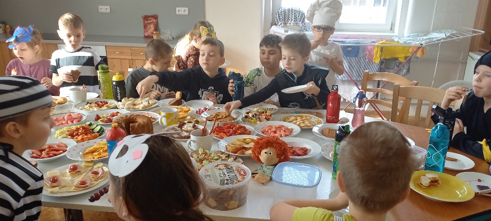 Při VV jsme si kreslili a vybarvovali Laufra, který jde v čele masopustního průvodu. Tučné úterý začalo přípravou trochu vydatnější svačiny.Potom jsme se převlékli do masek a šli jsme si pochutnat k našemu připravenému stolu.